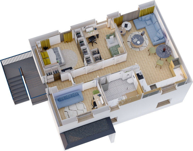 Odkryj przestrzeń i komfort w tym apartamencie na pierwszym piętrze z osobnym wejściem z boku budynku. Po wejściu na lewo znajduje się wygodna sypialnia, połączona ścianą z przestronnym gabinetem-idealne miejsce do odpoczynku i nauki. Naprzeciwko sypialni zlokalizowany jest uroczy pokój. Po drugiej stronie gabinetu znajduje się nowoczesna łazienka z prysznicem. Na końcu korytarza odkryjesz serce mieszkania – przestronny salon z otwarta kuchnią.