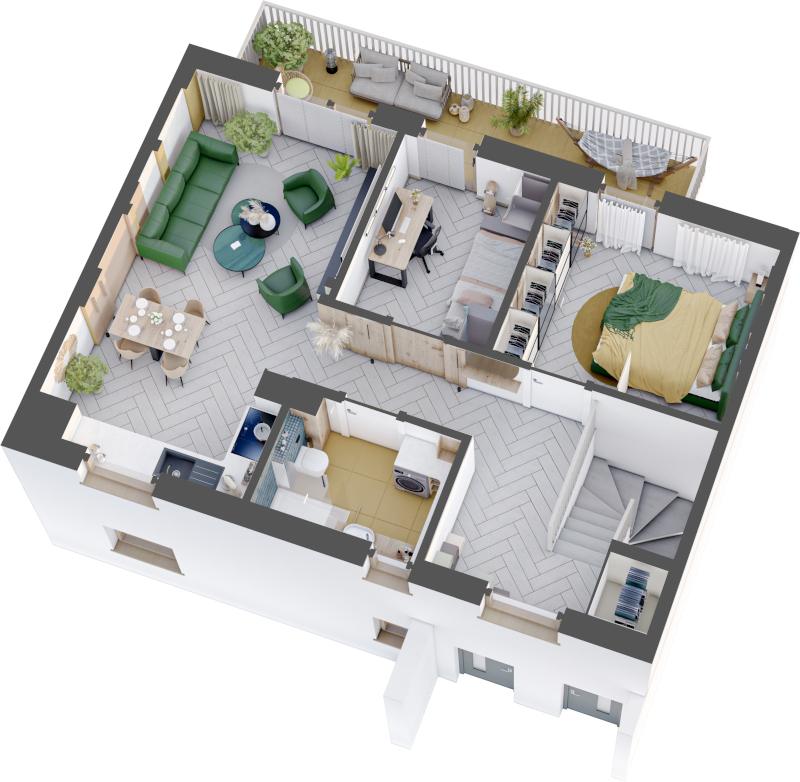 Mieszkanie znajduje się na pierwszym piętrze, do którego prowadzą schody wewnętrzne. Z przedpokoju na prawo znajduje się sypialnia a obok niej przestronny gabinet lub pokój dla dziecka. Naprzeciwko usytuowana jest przestronna łazienka. Za ścianą od pokoju dziecka znajduje się salon z aneksem kuchennym. Z każdego pokoju, można wyjść na duży balkon.